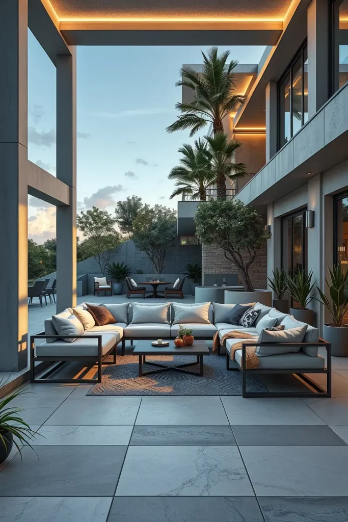 Key features include linear frames, structured cushions, and materials like steel, concrete, and engineered wood. I include these sofas because they bring discipline and clarity to outdoor layouts, especially in large or open terraces.