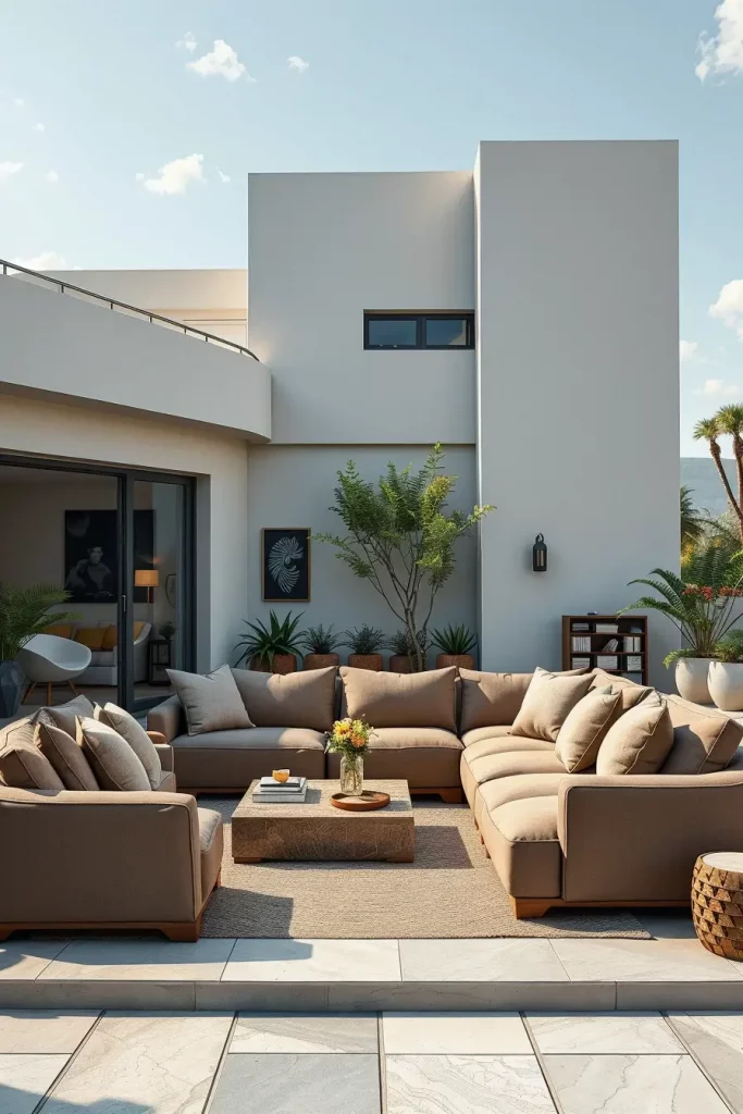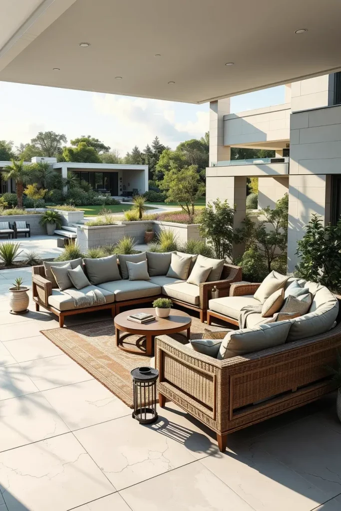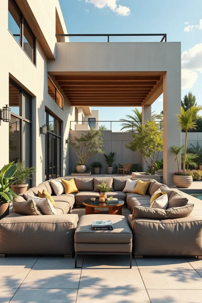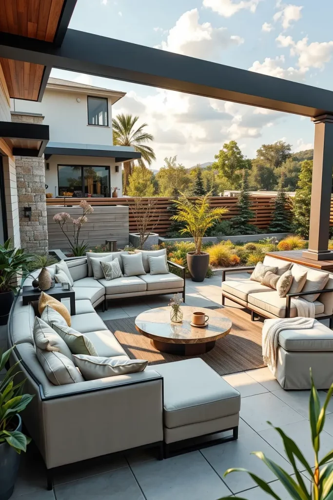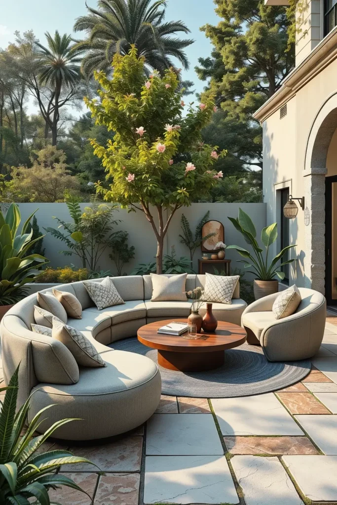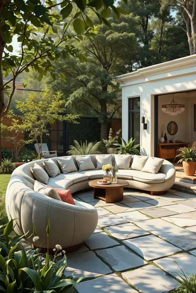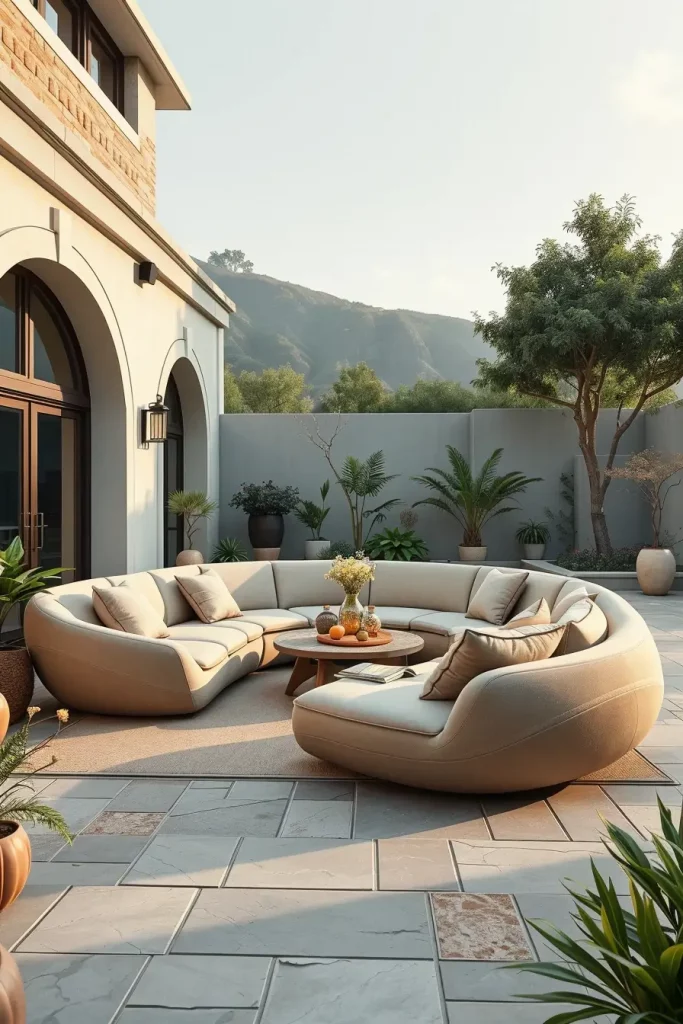 In my experience, designers highlighted by Architectural Digest emphasize that curved and enclosing furniture layouts promote a sense of comfort and connection, even in large outdoor spaces. I have seen this approach work especially well in homes where outdoor areas are used year-round, as the seating feels grounded and intentional rather than temporary.