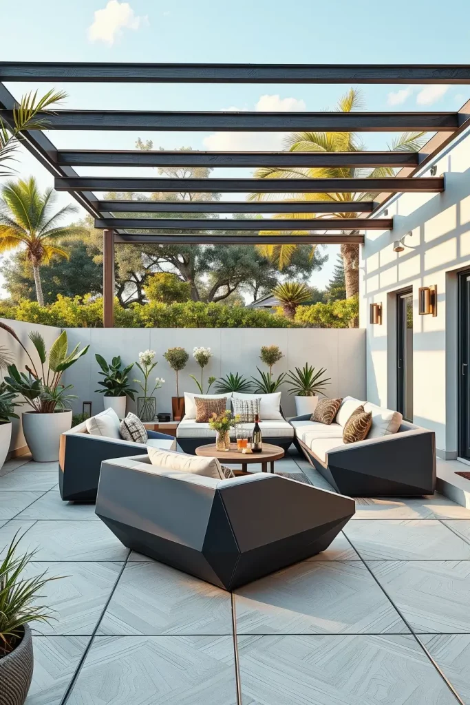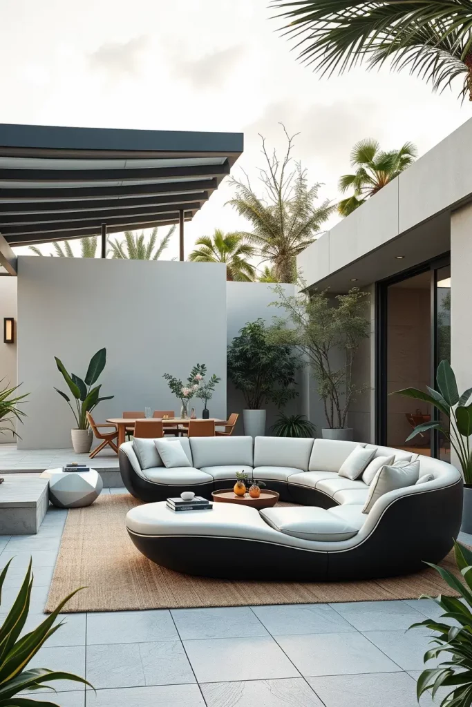 What could enhance this concept is the addition of geometric outdoor rugs or lighting fixtures that echo the sofa’s form.