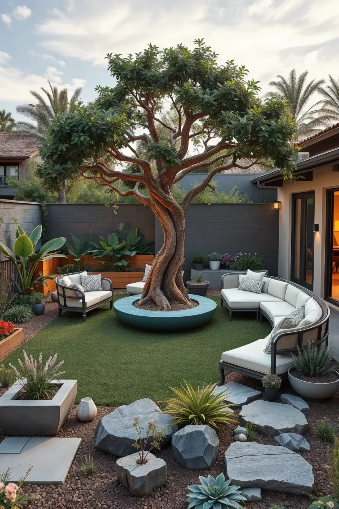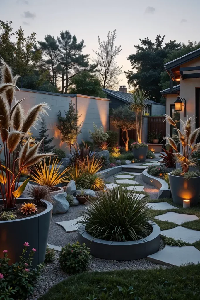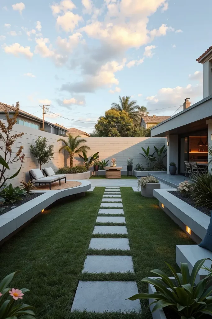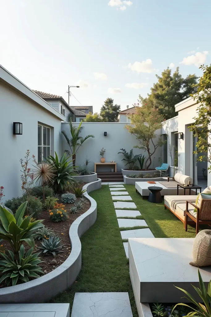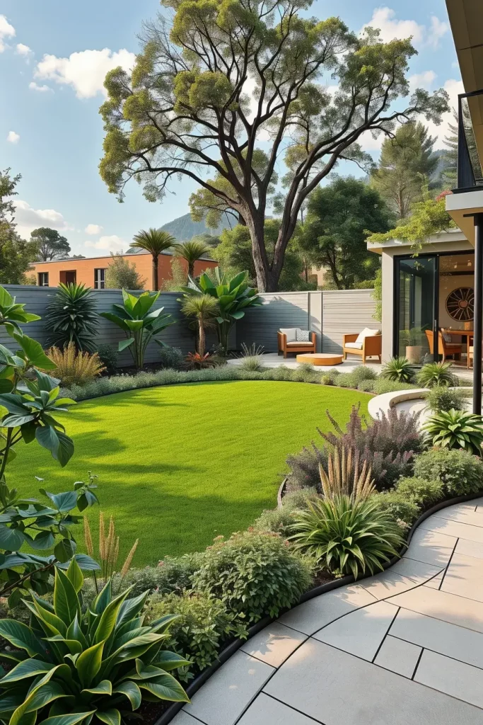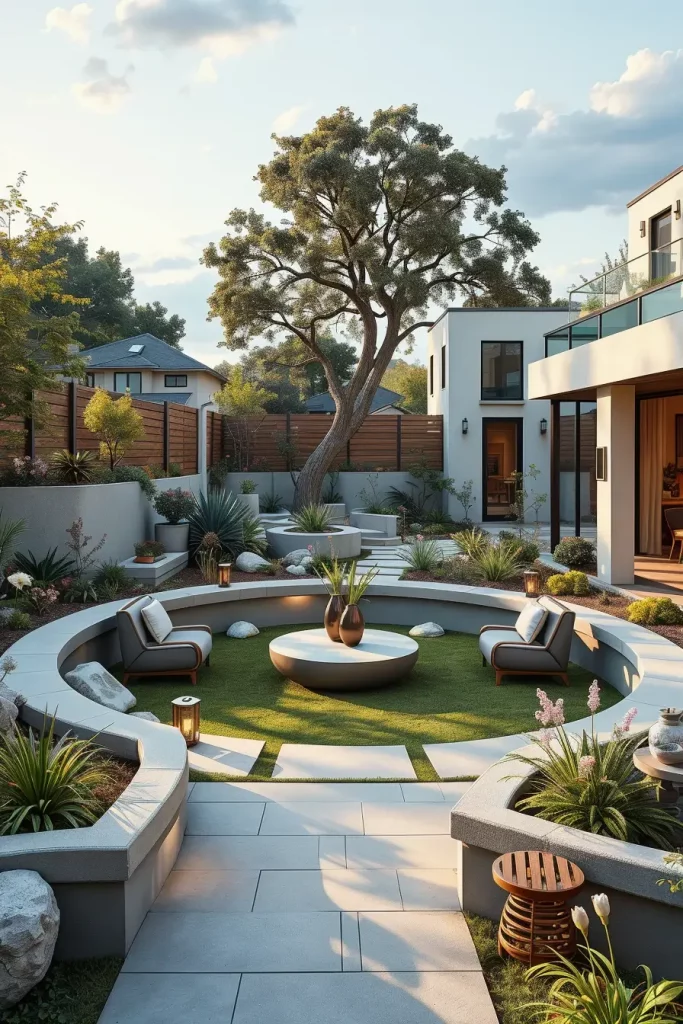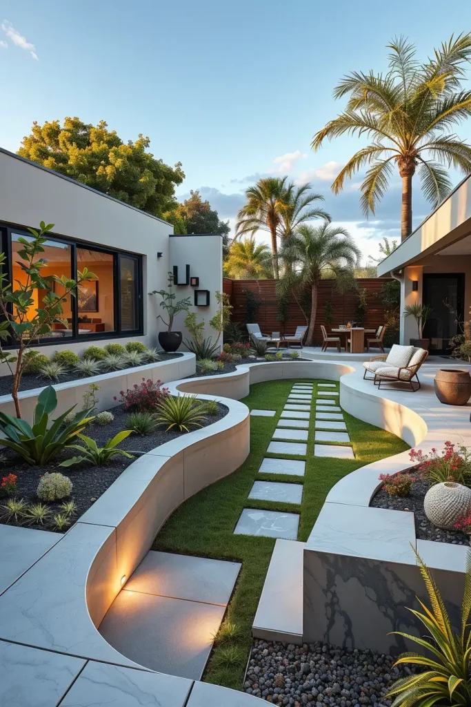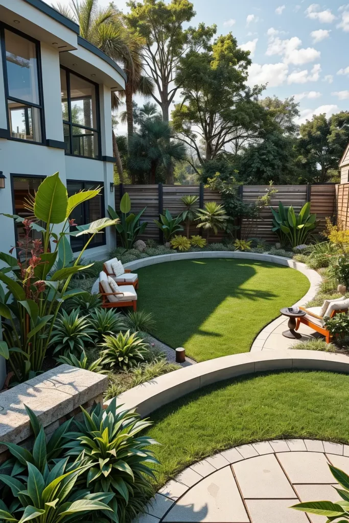 For smaller backyards, I rely on compact curved seating, built-in benches, vertical garden walls, and multi-functional furniture with rounded edges. In larger landscapes, I introduce sweeping curved lawns, sculptural pathways, and oversized modular furniture arranged in arcs. These elements help maintain cohesion and avoid fragmentation while supporting modern and designer backyard landscaping principles.