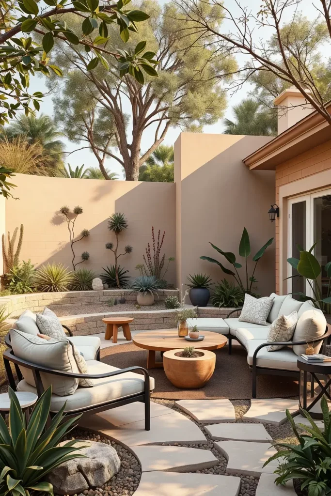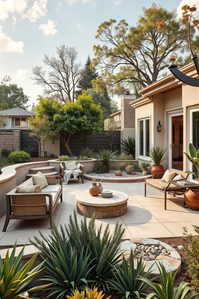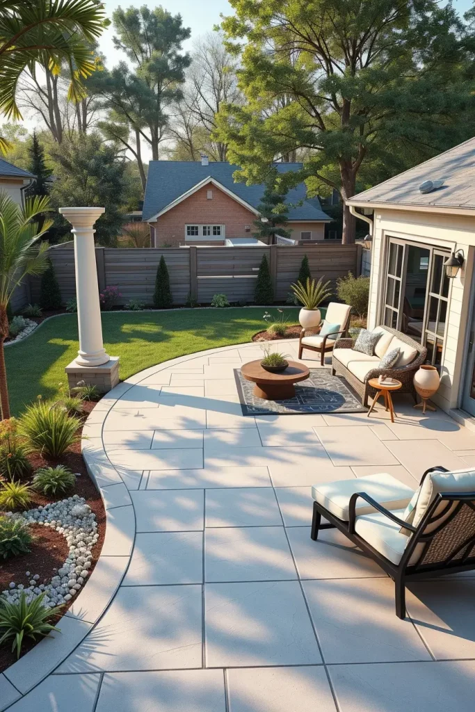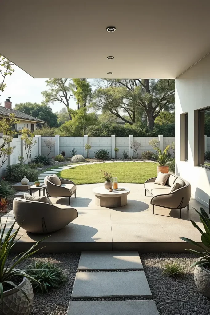 I typically shape patios with soft edges using concrete, stone, or large-format porcelain tiles. Curved built-in seating, rounded steps, and seamless transitions to adjacent areas enhance both safety and comfort. Furniture is selected to echo these forms, including curved sectionals, circular dining tables, and low-profile loungers.