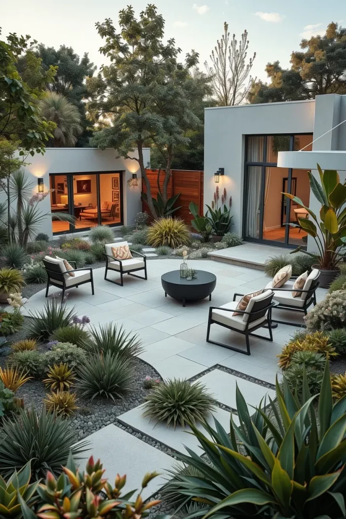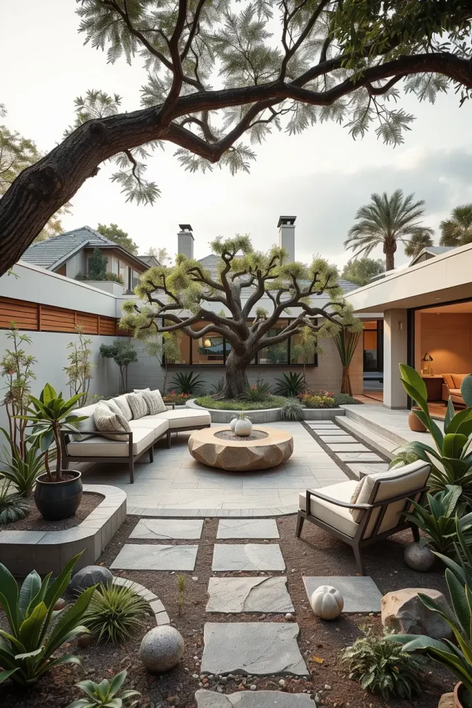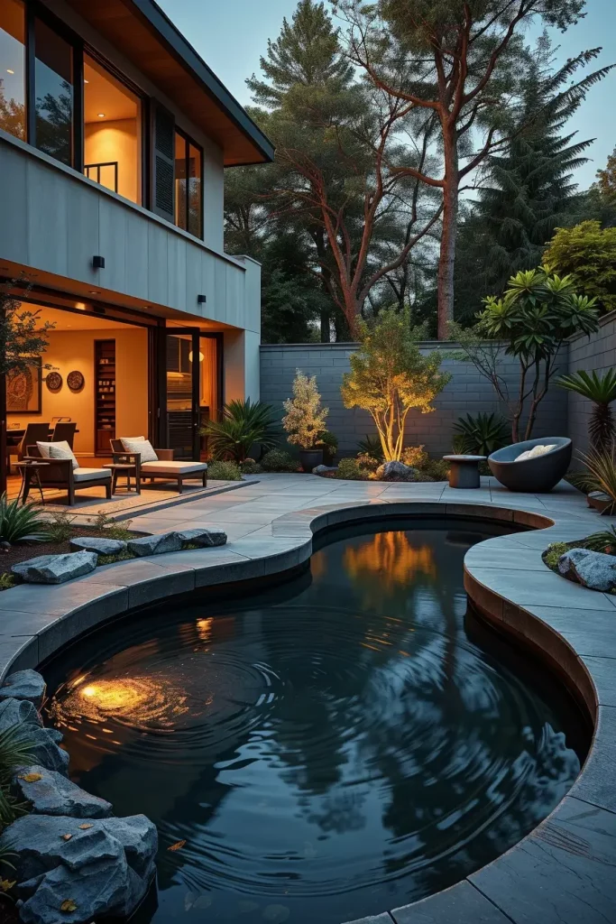 I often integrate shallow reflecting pools, curved fountains, or linear water rills with softened ends. Materials like dark stone, concrete, or metal finishes help the water surface stand out without overpowering the space. When paired with minimalist seating or lounge furniture nearby, these features create natural gathering points.