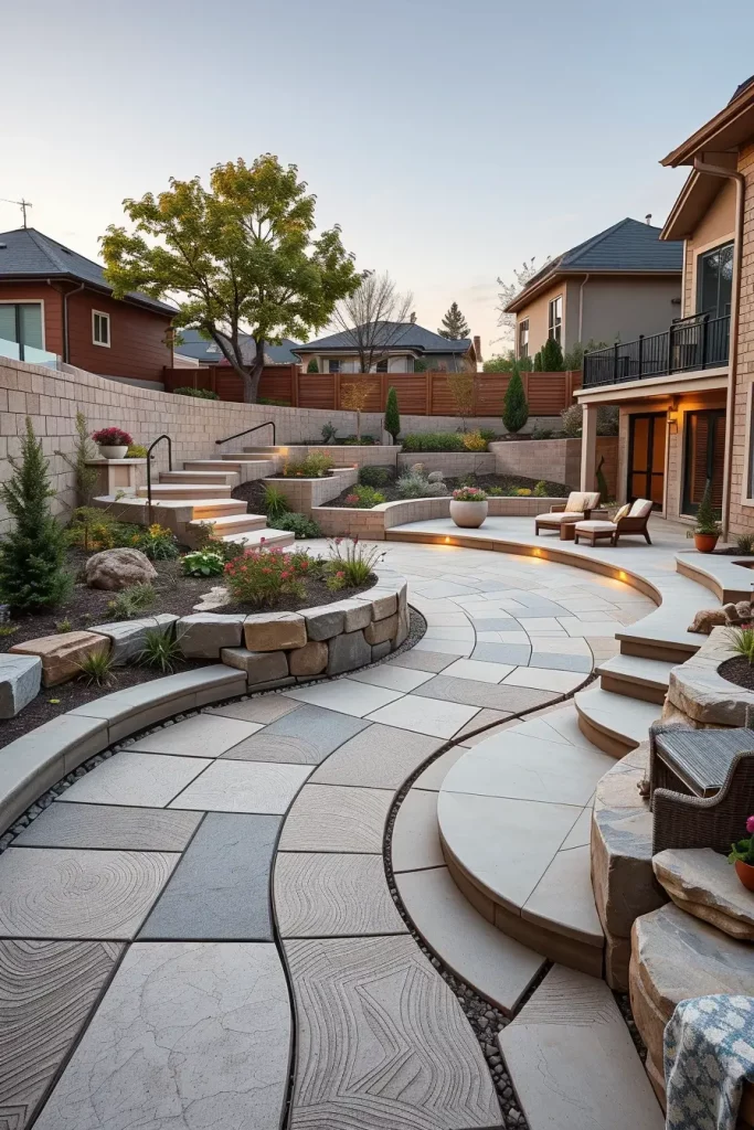 Modern patios in 2026 are no longer isolated slabs but integrated components of curved backyard landscapes. I design patios that flow naturally into lawns, planting beds, and pathways, making them feel like part of a continuous environment rather than a separate zone.