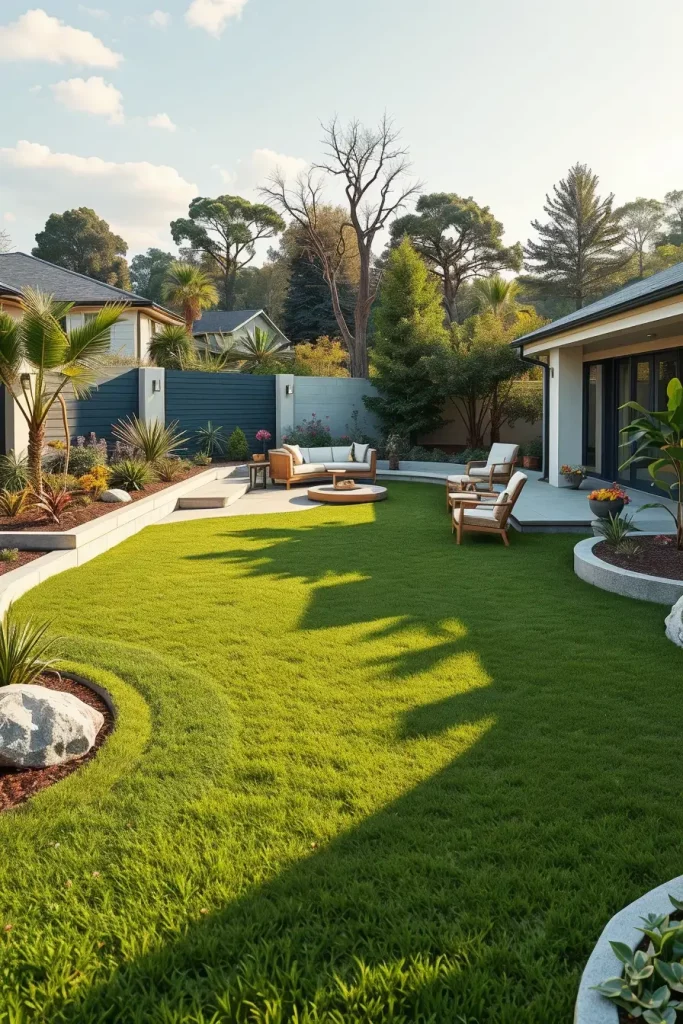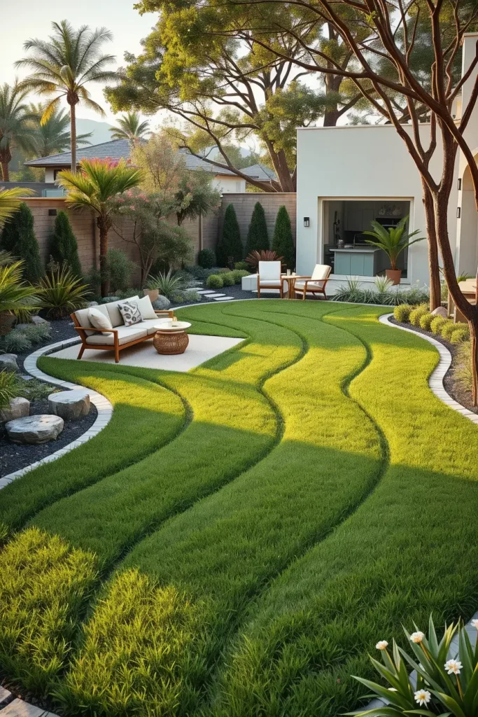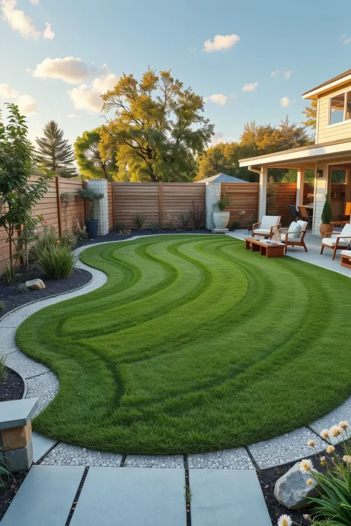 Traditional rectangular lawns are quickly being replaced by more expressive shapes in 2026 backyard design. I approach lawn areas as design elements rather than leftover space, shaping them with soft curves that integrate naturally with surrounding features. This makes the yard feel more cohesive and visually dynamic.