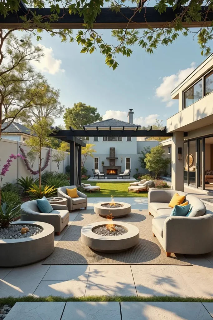 Fire pits have evolved into true focal points, and I design them as sculptural elements rather than simple utilities. Curved fire pit designs align perfectly with curved, designer backyard landscaping designs, offering warmth, visual interest, and year-round usability.