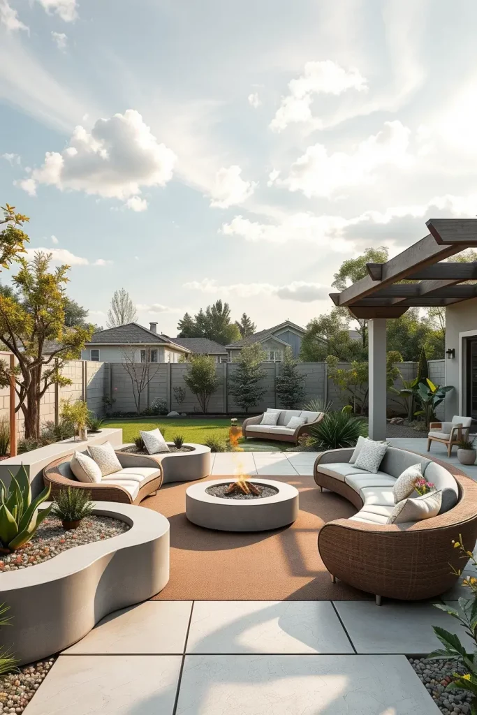 To complete this idea, I would add integrated shade solutions such as curved pergolas or cantilever umbrellas that follow the patio’s geometry and improve usability throughout the day.