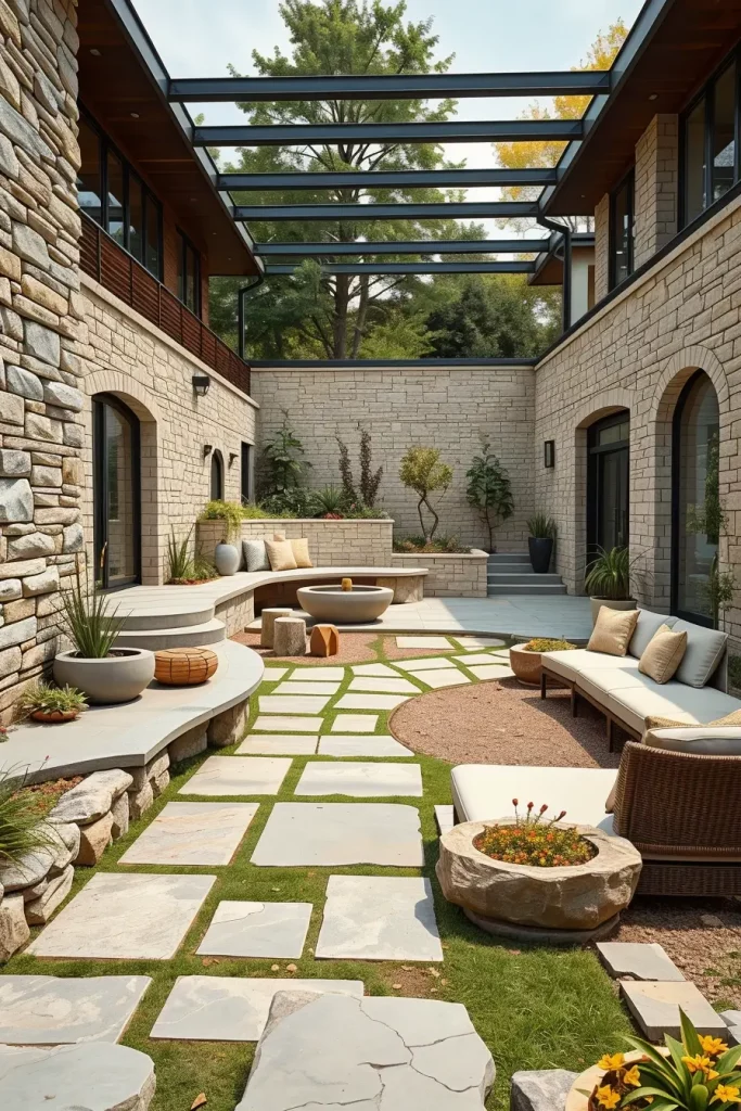 I carefully select stone finishes such as honed limestone, textured concrete stone, or smooth travertine to match the surrounding environment. Curved stone benches, fire features, and water edges add tactile richness and long-term value. I include stone because it ages beautifully and anchors lighter design elements like greenery and furniture.