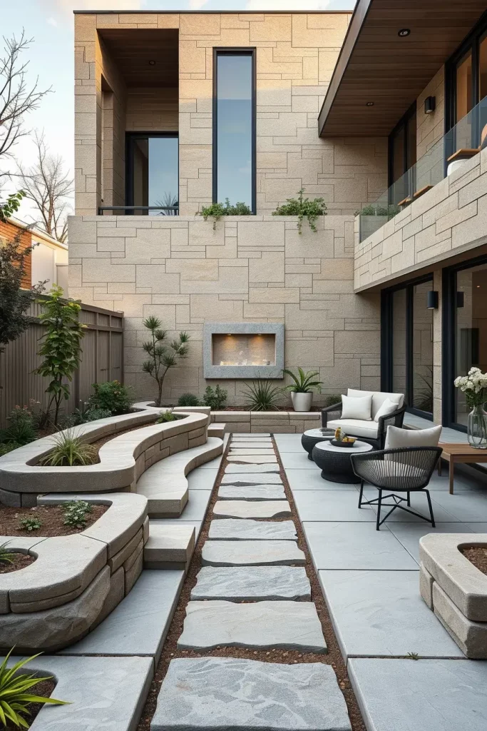 When I design outdoor spaces for 2026, stone becomes more than a material, it becomes a sculptural medium. Curved stone applications allow me to create organic retaining walls, seating ledges, and pathways that feel grounded yet artistic. This approach supports designer and modern backyard landscaping by blending durability with expressive form.