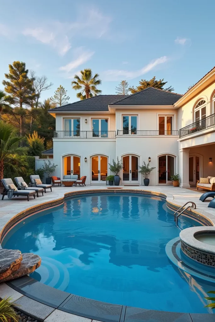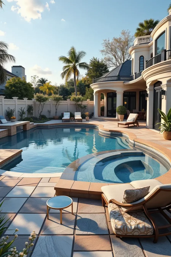I incorporate infinity edges, shallow lounging shelves, curved steps, and integrated seating within the pool itself. Surrounding furniture such as rounded sun loungers, sculptural side tables, and softly contoured shade structures enhances comfort and cohesion. Each element supports both relaxation and visual continuity.