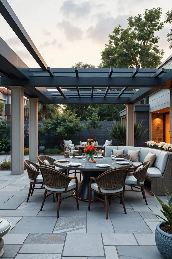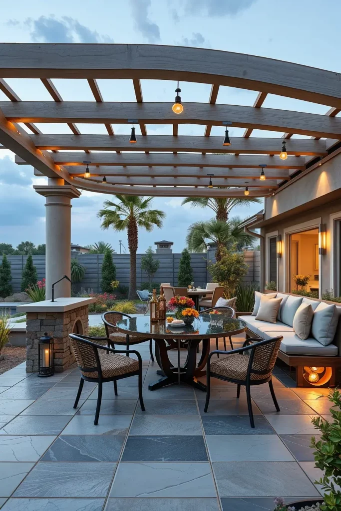 In practice, I integrate curved decking edges, arched pergolas, and rounded seating zones to define different functions within the same space. Furniture such as crescent-shaped benches, oval dining tables, and custom-built curved planters supports the overall geometry. These elements are not decorative alone; they help maximize seating capacity and encourage social interaction.