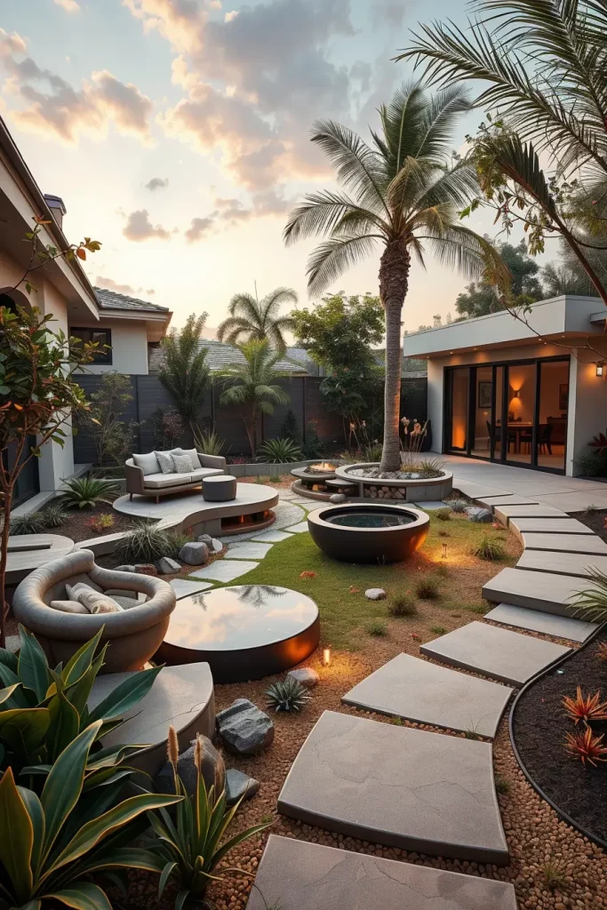 In my projects, I focus on combining hardscape and softscape elements seamlessly. Curved retaining walls, integrated seating ledges, and organically shaped planting beds replace straight fences and boxy lawns. Outdoor furniture follows the same logic: rounded sectional sofas, circular fire pits, and sculptural lighting fixtures help reinforce a cohesive design language while remaining highly functional for daily use.