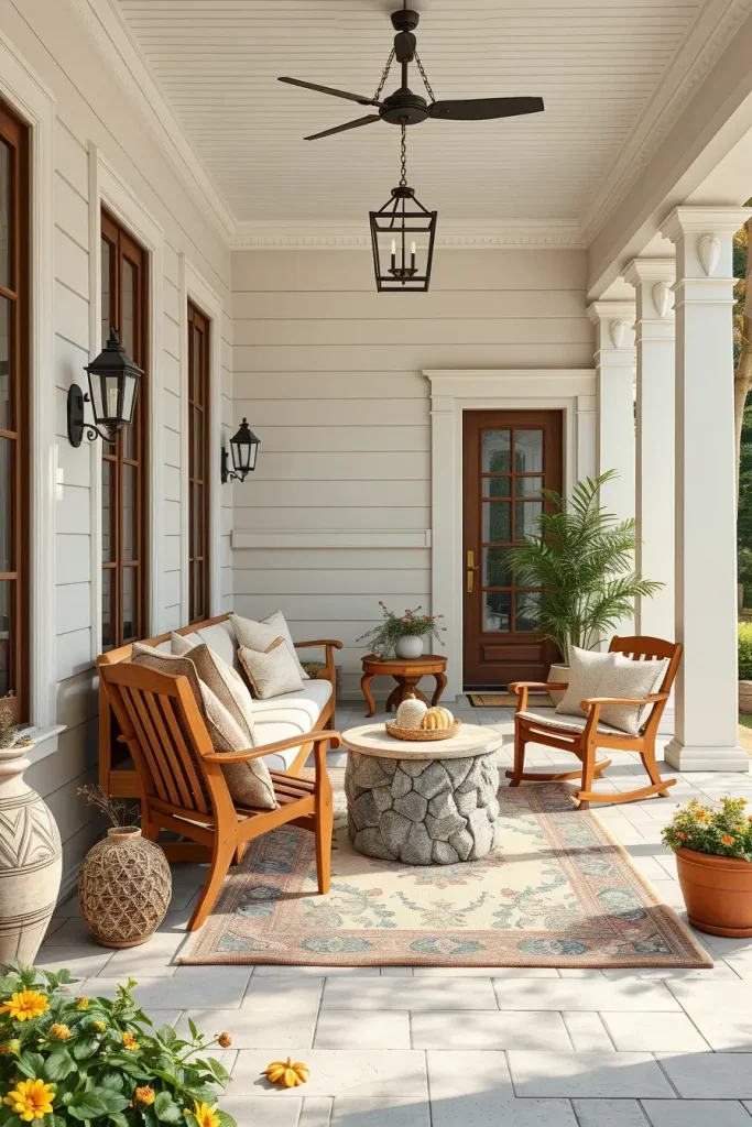 In my fall porches, I use neutral furniture, such as beige or gray seat cushions and add seasonal colors with accents: rust-colored pots, mustard yellow cushions or sage green door wreaths. These colors are vivid and sophisticated. A ceramic stool made of clay-pink or a matte slate lantern immediately upgrades the composition and appears timeless.