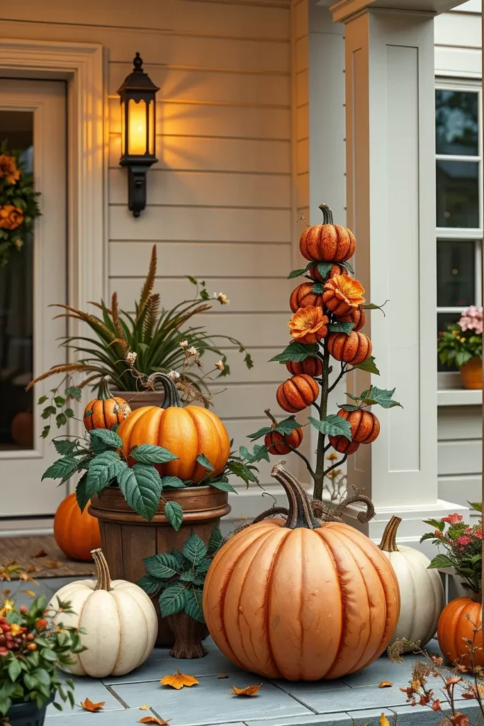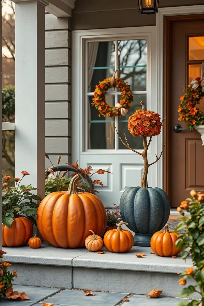 If you’re tired of the usual jack-o’-lanterns, let’s take a more artistic approach to pumpkins. In fall 2025, I am developing sculptural pumpkin installations that have layered textures and unusual materials. I group ceramic, velvet, and concrete pumpkins in uneven clusters on the steps of the porch. This catches the attention upwards and makes the entrance have a gallery look. Modern and minimalistic versions are also provided by tall topiary pumpkins composed of piled metallic or wooden shapes.