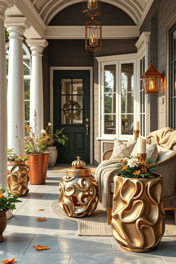 Introducing gold and copper details instantly adds coziness to a fall porch and indicates a sense of class and contemporary design. These metallics reflect the natural daylight and reflect soft light in the evenings, providing a soft glow without being overpowering the setting. They are timeless and when used sparingly, they can be used in any design style, whether transitional to contemporary.