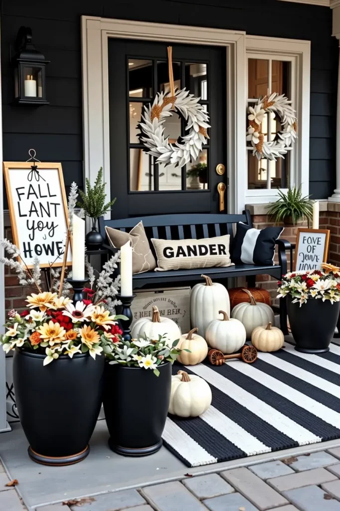In some cases, black and white color scheme is the most daring statement you can make. This black and white outfit is trendy, urban, and decidedly modern in fall 2025. I adore the effect of this contrast to bring out structure and form – particularly on clean-lined porches. It is a sophisticated but surprising seasonal decor.