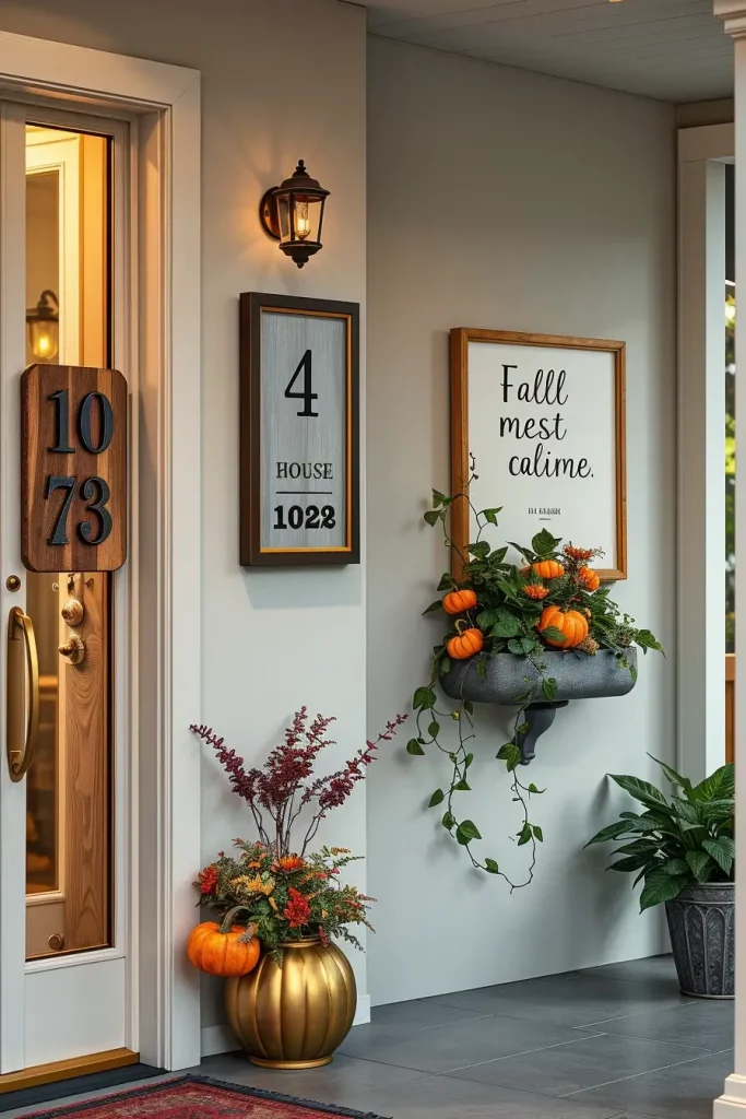 I never fail to add some decorations such as wheat stalks or small decorative gourds around the bottom of the number display. In case there is a wall space, a framed sign with a seasonal quote such as Harvest Home in clean typography will help balance modern design with holiday cheer. A planter under the numbers that is mounted to the wall and filled with trailing ivy and mini pumpkins brings in movement and softness.