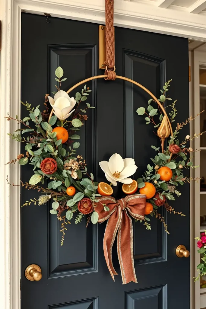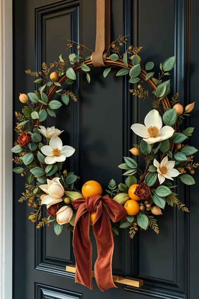 Wreaths are a fall classic, but in 2025, they have taken them way beyond burlap and pinecones. I choose classy wreaths that combine modern materials with fall style. My most preferred design has a base of brass hoop and asymmetrical foliage: magnolia leaves, dried citrus slices, and preserved eucalyptus. Add some high-end accents such as dried orchids or a velvet ribbon.