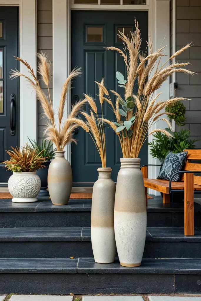 The most effortless method I use to incorporate a seasonal influence to a porch without clutter is through designer vases and harvest arrangements. These vases are sculptural decor in their own right tall, narrow, ceramic, matte porcelain or fluted glass. In fall 2025, I am incorporating neutral-colored vases such as sand, smoke gray and bone white, which look so lovely against the warm hues of autumn flowers.