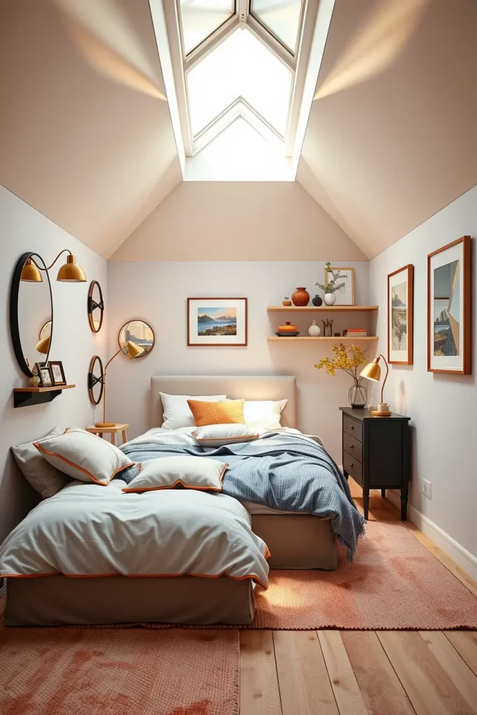 In case of furnishings, I would choose a multifunctional furniture, including storage beds, small dressers, and lamps mounted on walls to minimize clutter. Natural light can be increased using the mirrors which are placed strategically opposite to the skylights, and the balance of the framed artwork which is placed low on the walls helps to create harmony without competing with the angular ceiling. The decor is also completed with the use of soft throw blankets, narrow shelving, and small potted greenery (only in the areas where they do not obstruct foot traffic).