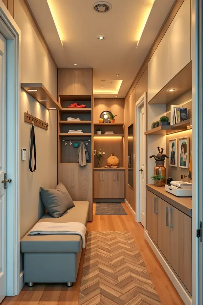 To add some functionality, I include practical pieces of furniture i.e. wall-hanging coat hooks, a storage bench or a console with drawers to use in daily life. The trick is that the items must be selected with low profiles in order not to overload the walkway. Specifically placed mirrors can be used to increase the visual width of the area and reflect the natural lighting to enhance the aesthetic and convenience.