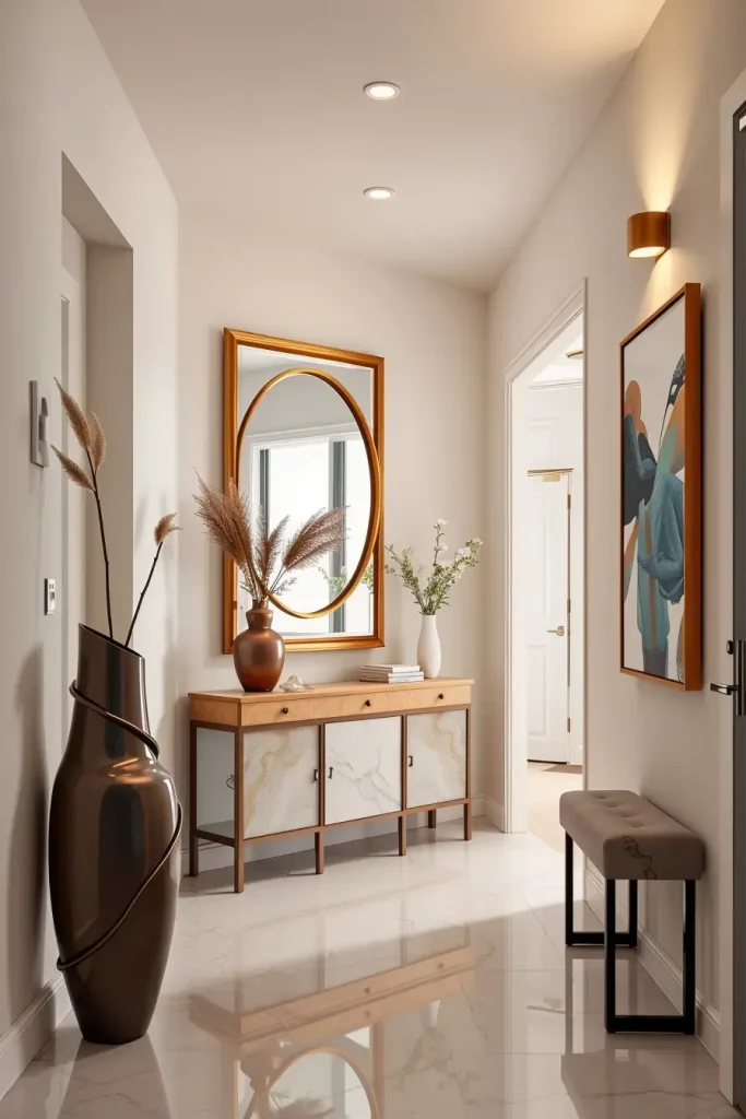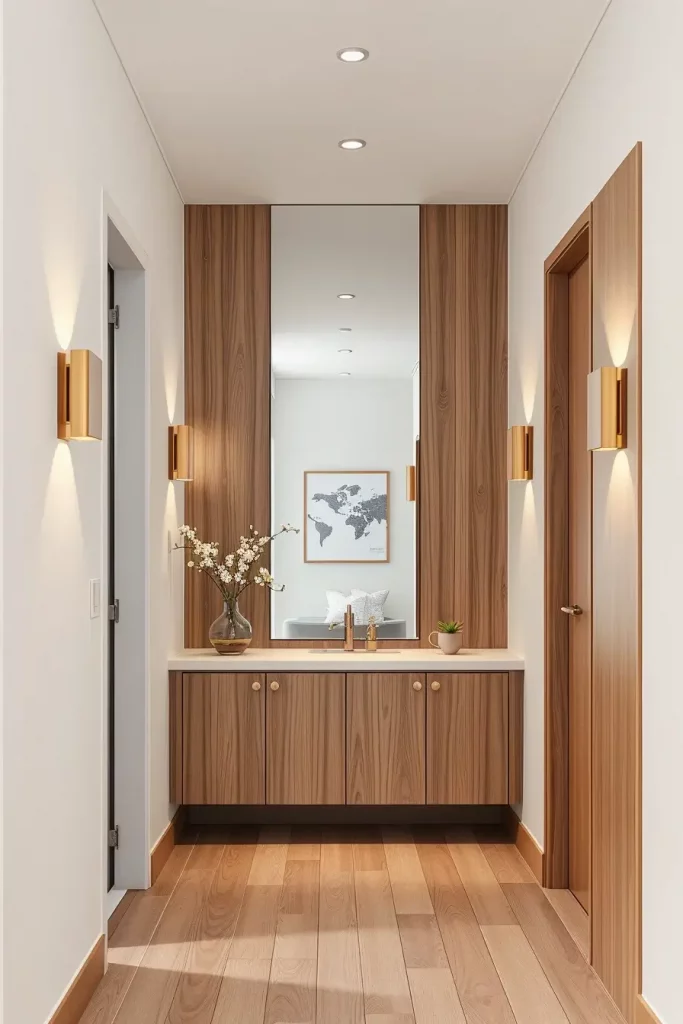 Metallic accents are able to make an immediate upgrade on a hallway giving it a touch of shine and depth as well as visual elegance. In my remodels with the application of this concept, I use metals like brushed gold, chrome or bronze in the hardware, lighting or decorative accessories. These accents reflect the light and form the effects of reflections that lighten the space in a natural way.