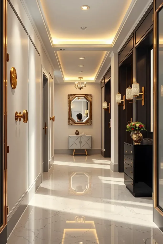 To finish this idea, I would also provide some recommendations regarding the use of metallic accents in small hallways to not overcrowd the visual space.