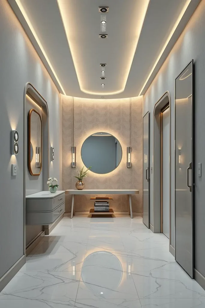 A future-forward hallway should have furniture and other decor with a purpose of functionality and high tech. I prefer floating console tables, embedded shelving in the wall, and concealed storage, which is incorporated into the building. The futuristic appearance is associated with LED-lit artworks, frameless mirrors, and wall panels with textured surfaces that are made of sustainable materials. Brushed aluminum, matte lacquer, and engineered stone are some of the materials that are used in addition to the entire look.