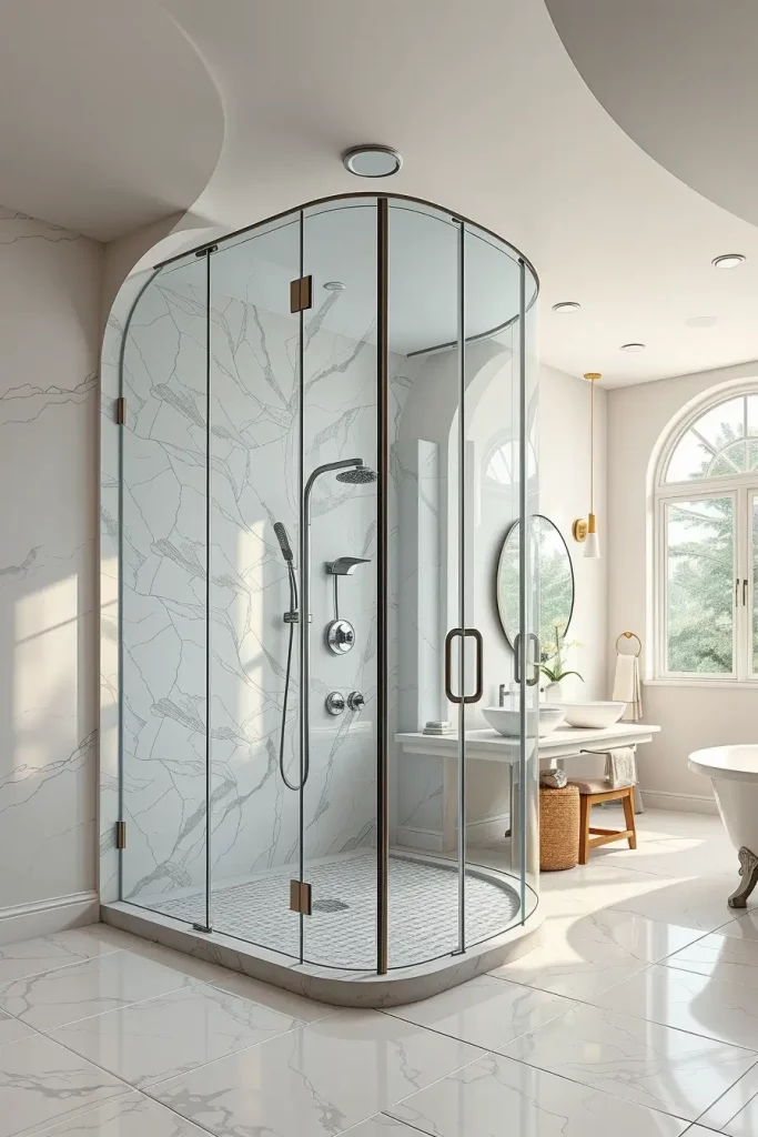 I also come up with floating curved vanities which are meant to give the impression of lightening the master bathroom without compromising the functionality. By openness, these vanities add to the feeling of being free in 2026 by the fact that it liberates the floor space and the light flows freely. The sweeping geometry removes sharp edges and is soft and inviting to the point of focus which feels exceptionally contemporary.