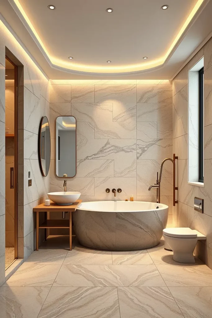 The furnishings are conscious and peaceful. The oval soaking tub located next to a window, the sculptural vanity with the integrated light, and the minimalistic seating items turn the bathroom into the relaxation place. The use of natural stone surfaces, warmer neutrals, and slight contrasts support a spa-like ambiance and at the same time are clearly modern.