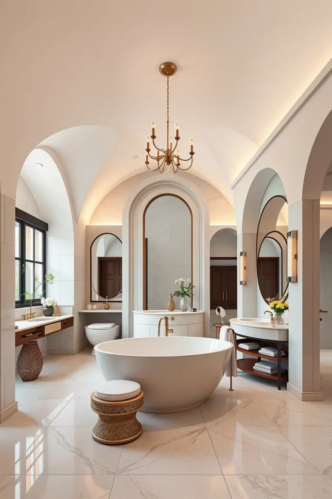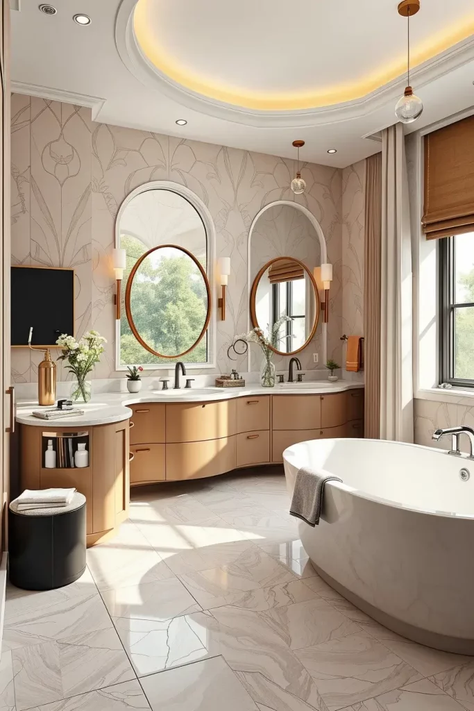 Practically, oval shapes affect the floor layouts, ceiling details, etc. The movement is visually directed with the use of oval-shaped rugs, curved floor inlays, and rounded ceiling recesses to ensure that the design does not disintegrate. There is also the advantage of furniture placement, whereby the designer vanities and tubs do not feel out of place.