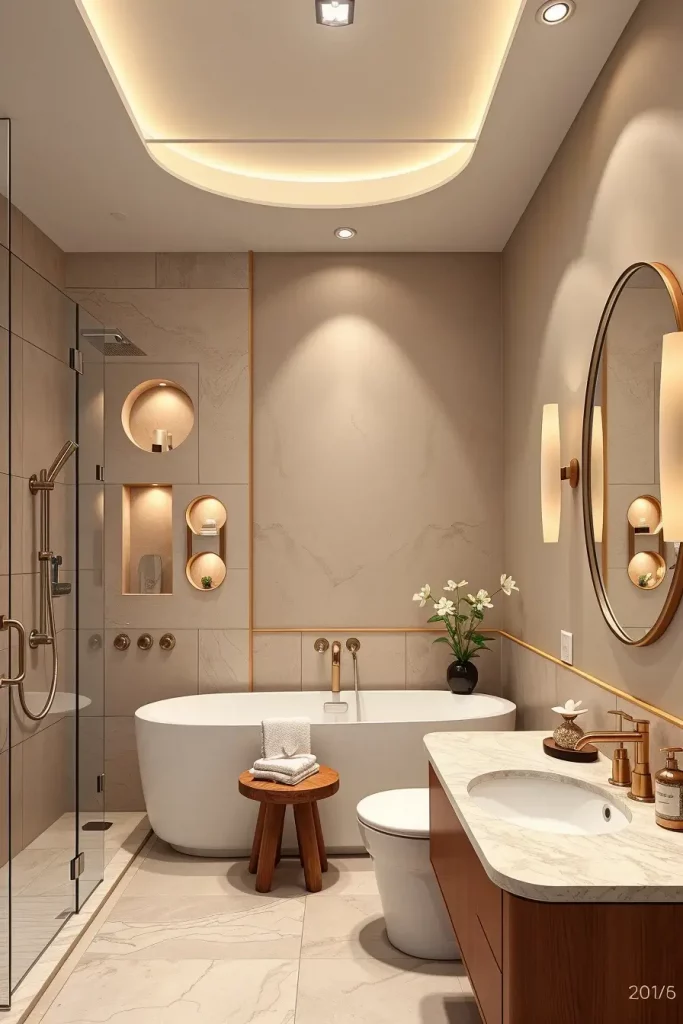 I am too employing more rounded wall niches in master bath 2026 concepts since they combine storage and architecture in a clean, sophisticated manner. Niches cut into the shower walls or placed close to freestanding tubs are softly curved so they do not disrupt the visual flow which is a critical element in contemporary, curved interiors.