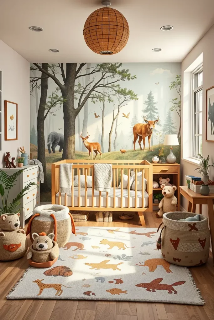 I suggest wooden low profile cribs, rounded edges dressers and upholstered furniture in organic textures in these nurseries. The murals depicting animals (forest, underwater worlds, etc.) are used as decorative and educational elements. The storage baskets and animal shaped soft play rugs with nature patterns are functional but also work to support the theme in a unifying manner.