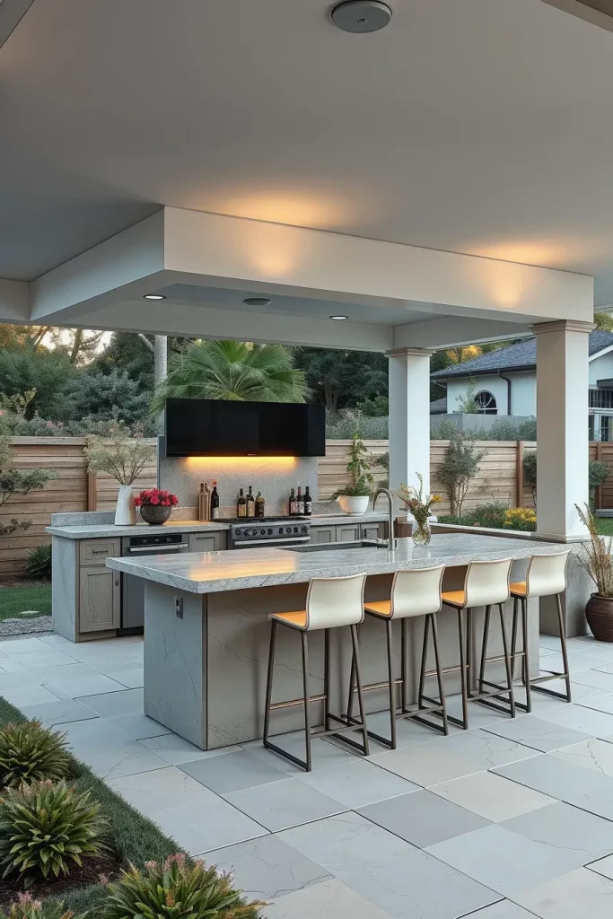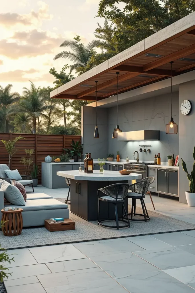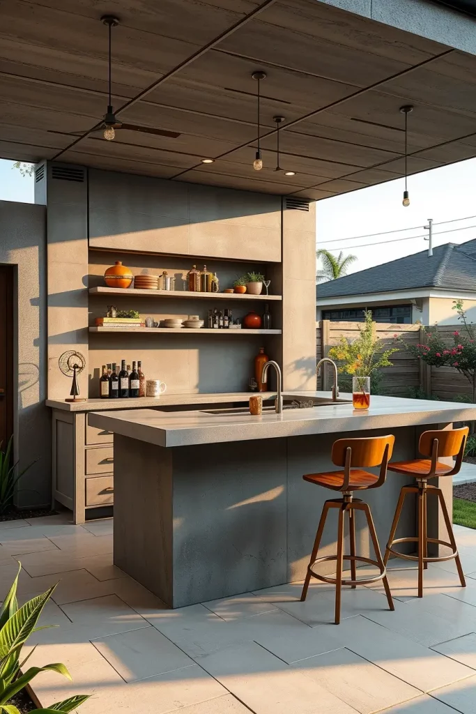 I often pair concrete counters with open metal shelving, integrated sinks, and weather-resistant cabinetry. Bar stools in wood or leather-look materials help soften the industrial feel while maintaining visual contrast. The weight and texture of concrete add depth and character to the backyard environment.