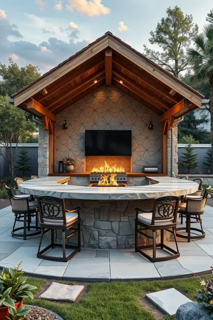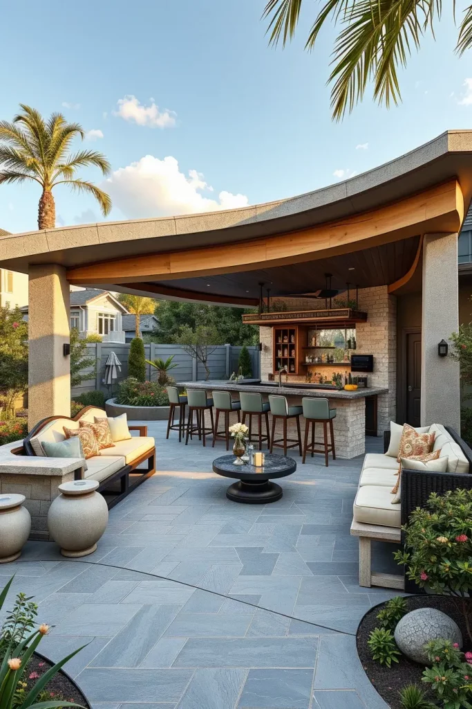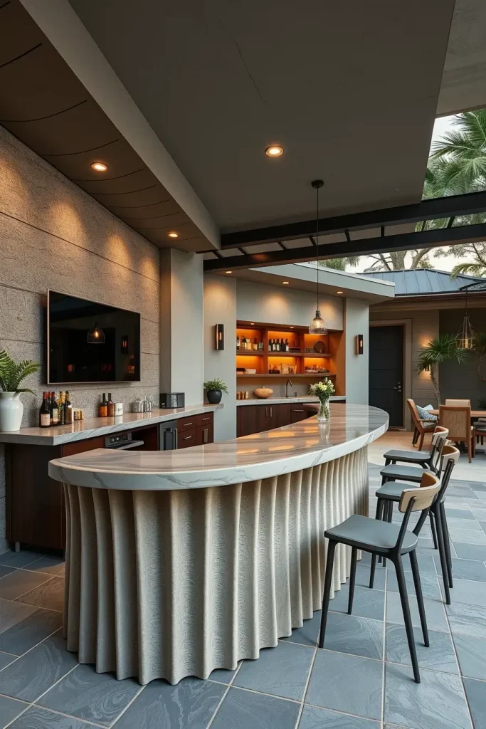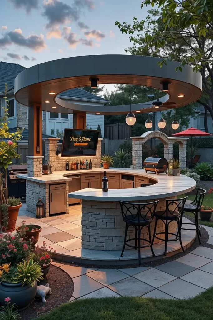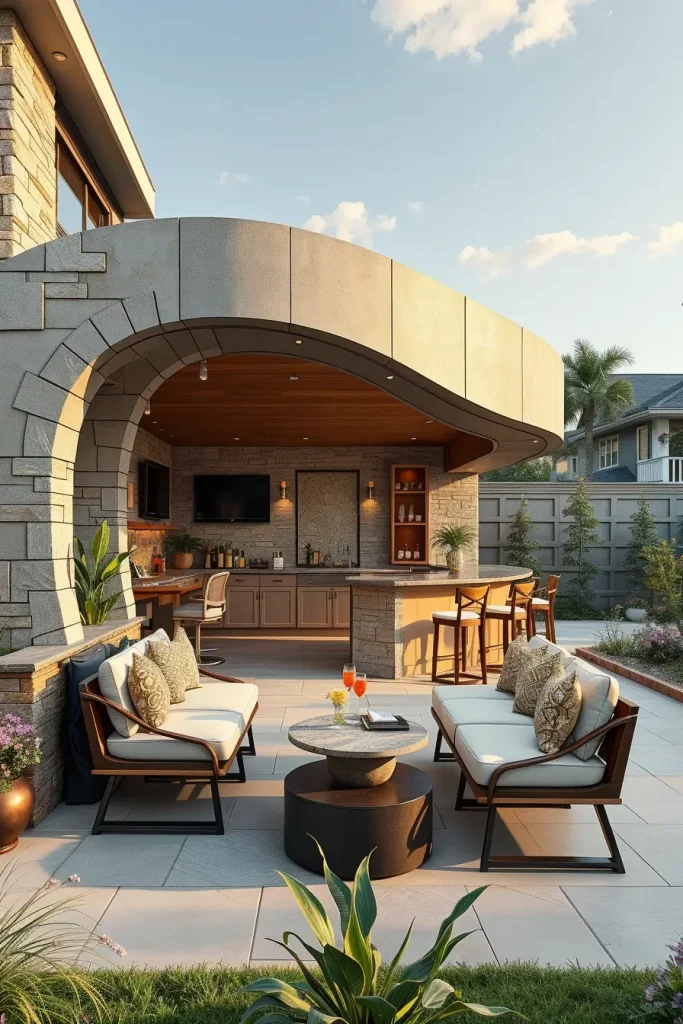 Curved outdoor bar layouts are designed to naturally guide movement and interaction. I use this approach to soften rigid backyard layouts and encourage social engagement. These unique outdoor bars feel inviting and intuitive, making them ideal for gatherings.