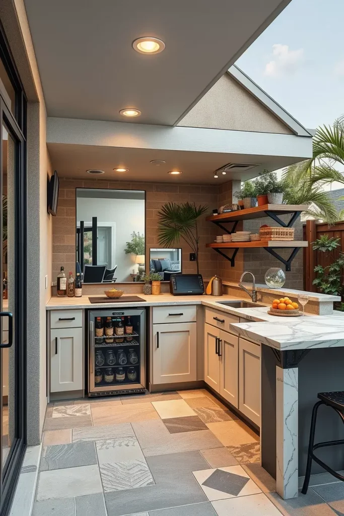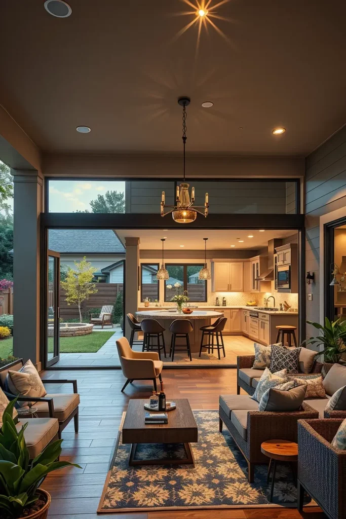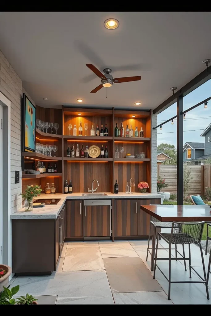 Seamless indoor-outdoor transitions define some of the most modern and stylish outdoor bars for backyard 2026. I design these bars to visually and functionally connect interior living spaces with the backyard, creating one continuous entertaining environment.