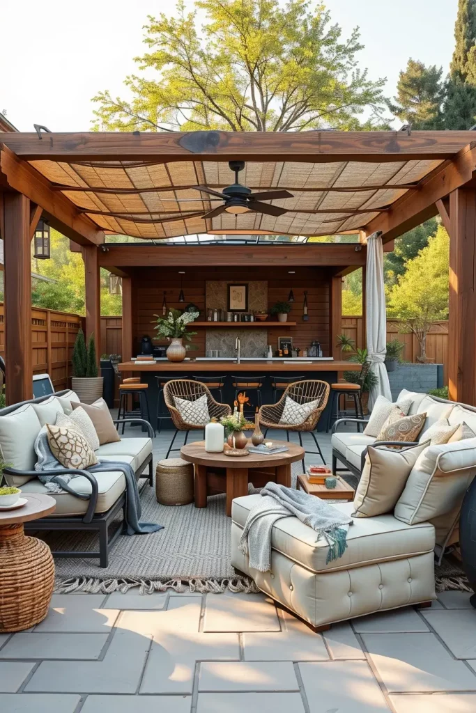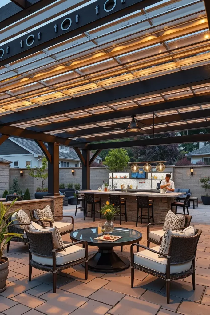 Architectural shade structures define comfort in modern outdoor bars, especially during warmer months. Pergolas provide both visual structure and functional relief from sun exposure, making them a core element in outdoor bar ideas on backyard 2026.