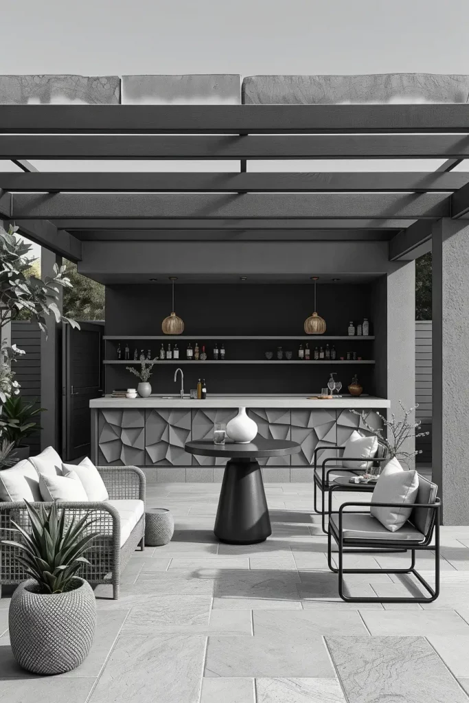 Monochrome palettes define some of the most stylish and unique outdoor bars I design for backyard 2026. By limiting color variation, I can focus on texture, form, and material quality to create a refined atmosphere.