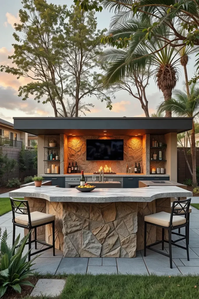 Backyard bars with integrated fire features bring warmth, ambiance, and functionality into evening entertaining. I design these modern outdoor bars to serve as nighttime focal points, making the backyard usable well beyond sunset. Fire elements also add a sense of luxury and comfort without excessive decoration.