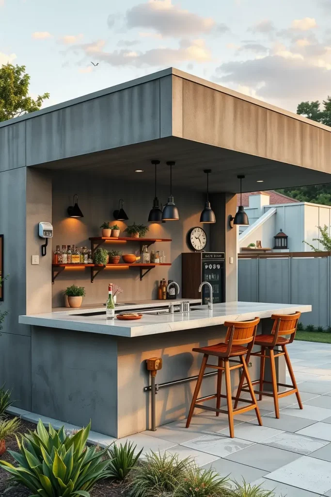 Concrete backyard bars offer a bold and grounded presence that aligns perfectly with modern outdoor bar ideas for 2026. I use concrete to anchor open spaces and give the bar a sense of permanence. Its durability also makes it ideal for year-round outdoor use.