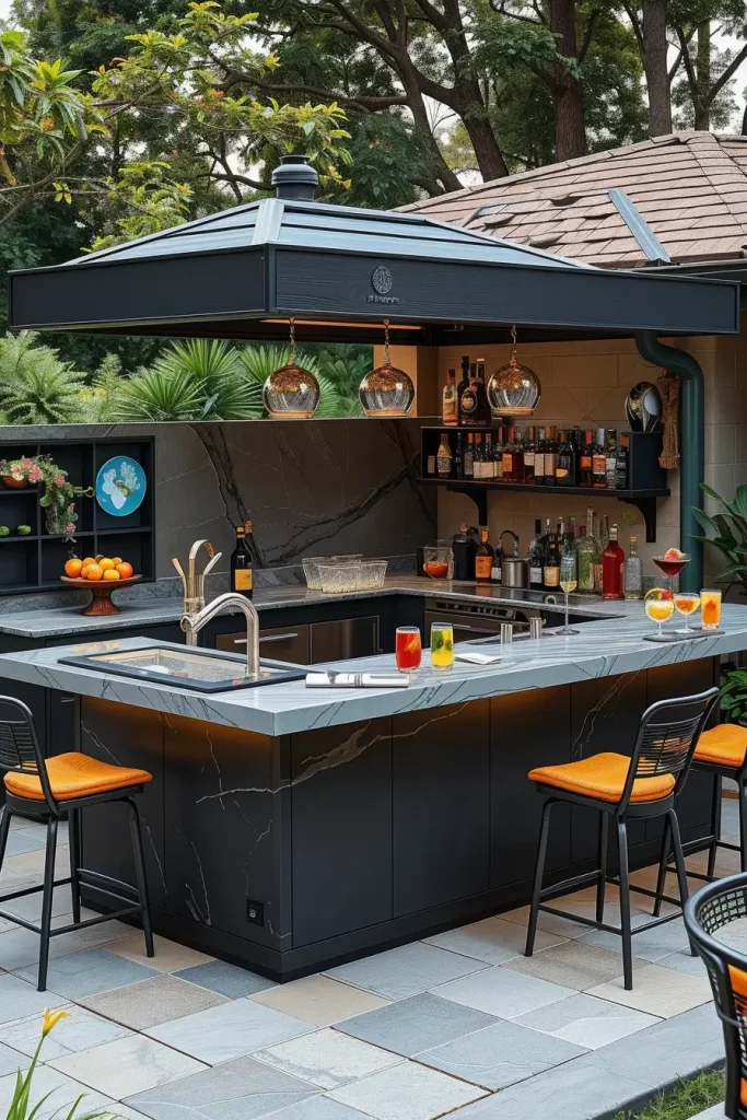 Designer Backyard Bars With Statement Countertops And Finishes