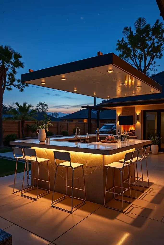 LED lighting transforms outdoor bars into nighttime showpieces. I design these modern backyard bars with layered lighting strategies that enhance form, function, and atmosphere. In 2026, smart lighting systems are integral to outdoor bar design.