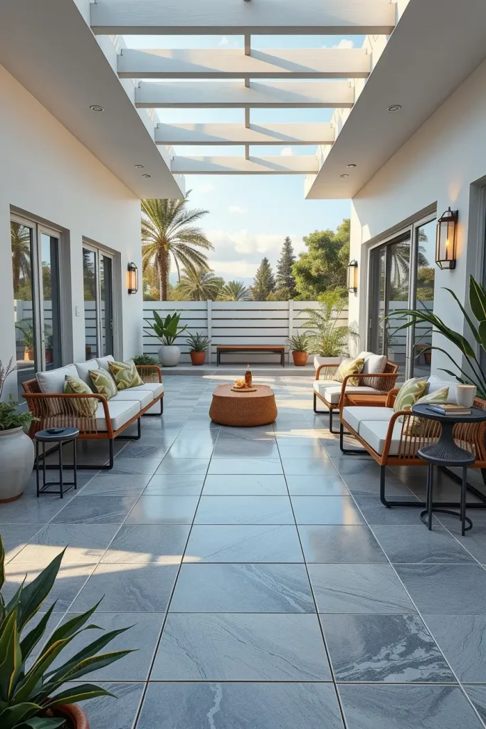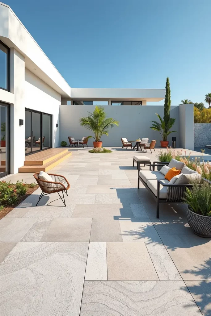 Popular options include large-format porcelain slabs, textured concrete, and patterned stone layouts. I select flooring based on durability, slip resistance, and its ability to visually connect the patio to the architecture of the home.