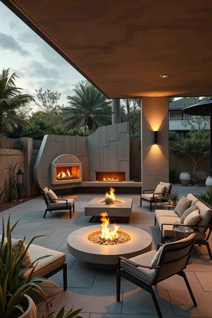 Fire features remain a centerpiece in designer patios, but in 2026 they appear more sculptural and refined. I treat fire elements as functional art pieces that anchor the overall layout.