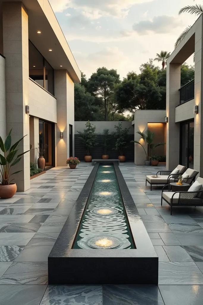Common solutions I incorporate include linear reflecting pools, minimalist fountains, or shallow water basins integrated into seating areas. These features pair beautifully with stone, concrete, and soft lighting, reinforcing a modern and tranquil mood.