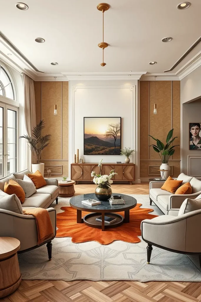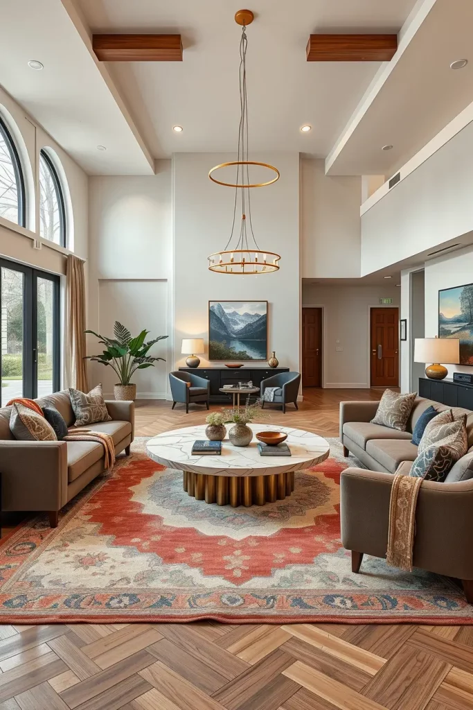 The combination of circular tables and curved couches gives a unified and flowing effect in the layout of the living room that will be easily recognizable as a 2026 fashion. I frequently combine it with large spaces to make them less harsh and more comfortable.