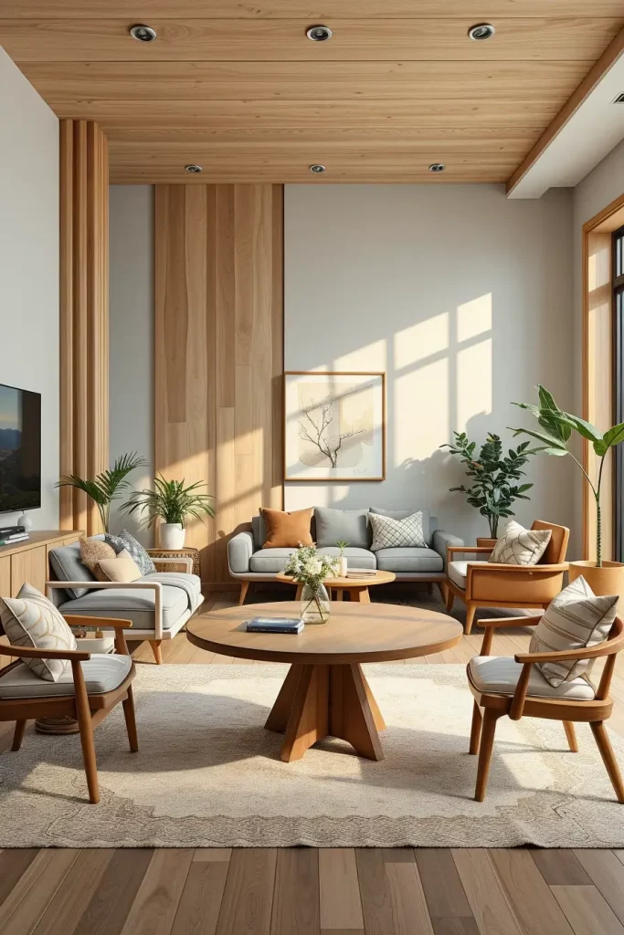 My experience has shown that round coffee tables made of light wood or slightly bigger round center tables are the most suitable ones in such spaces. I tend to match them with low profile sofas, area rugs which are textured and low on shelving to keep them in visual harmony. The lack of sharp edges makes the layout look less strict and less violent towards family based homes. I would also suggest such finishes as natural oak, ash, or matte white surface, which will add the airiness that Scandinavian interiors are associated with.