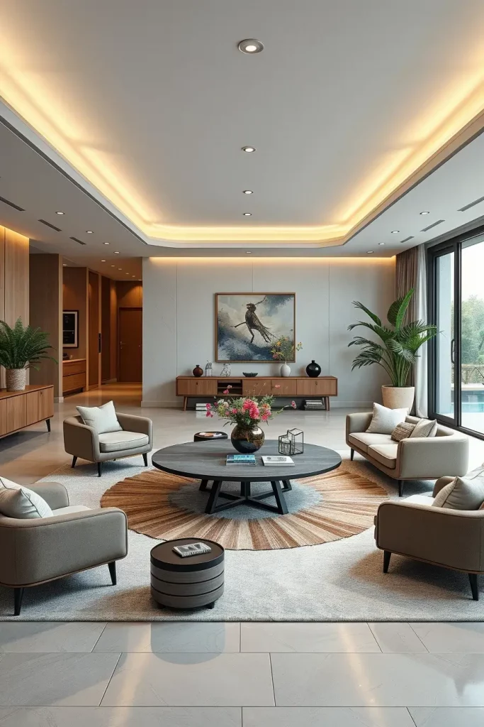 In round table living room 2026 ideas, I usually create designs in which the round table occupies the social centre of the area. The furniture is circular and creates naturally a conversation and use together.