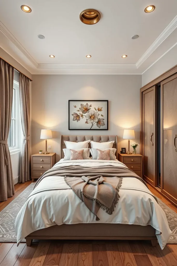 Neutral palettes are classic and in 2026, they will continue to be one of my preferred approaches to designing a small bedroom that is elegant. The colors used to form a background (beige, gray, white, and taupe) are very soothing and the room appears to be light and elegant.
