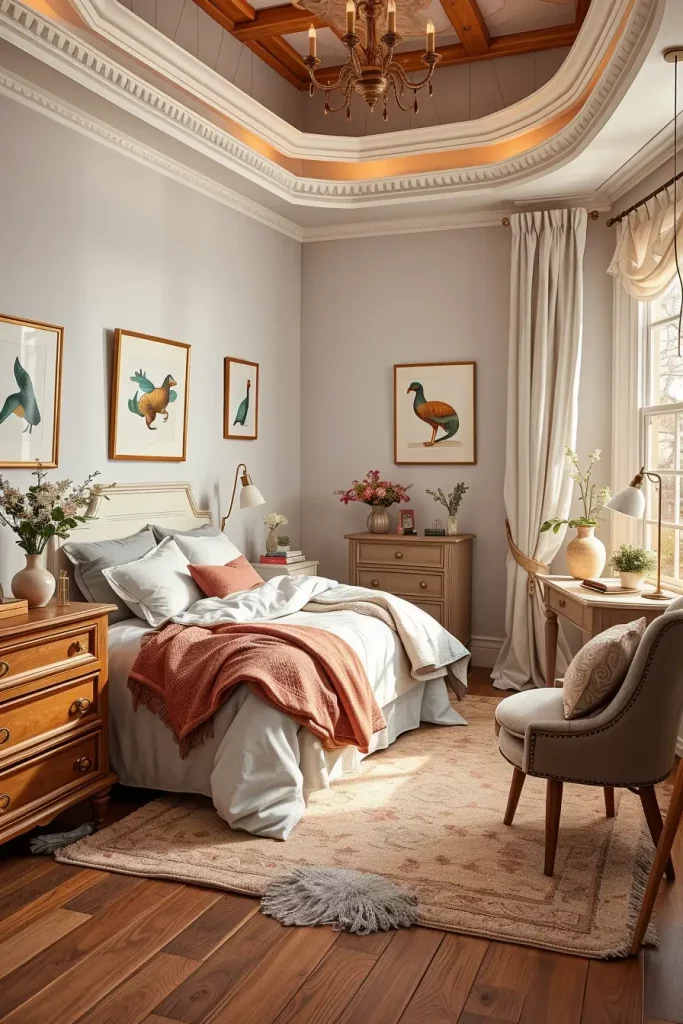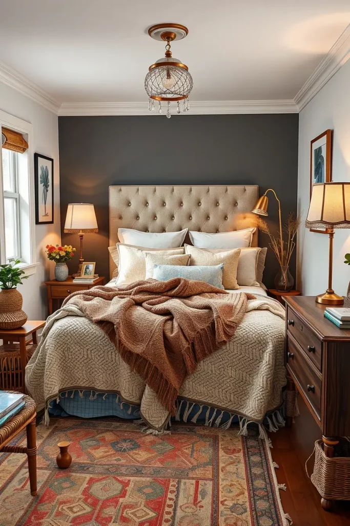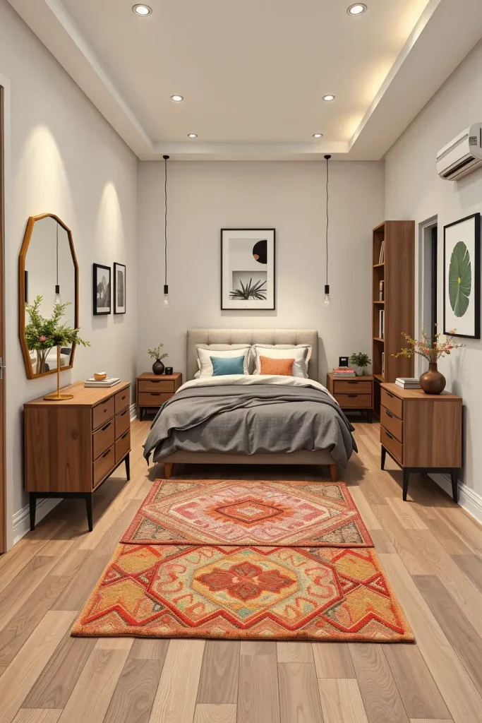 In the case of furniture, I will suggest slim dressers, vanity tables with concealed storage, and stylish lighting such as pendant lamps or sconces. There is also the use of accent chairs or benches at the end of the bed when there is space. The details of decor like framed art, plush throws, and patterned pillows provide personality without being cluttered.