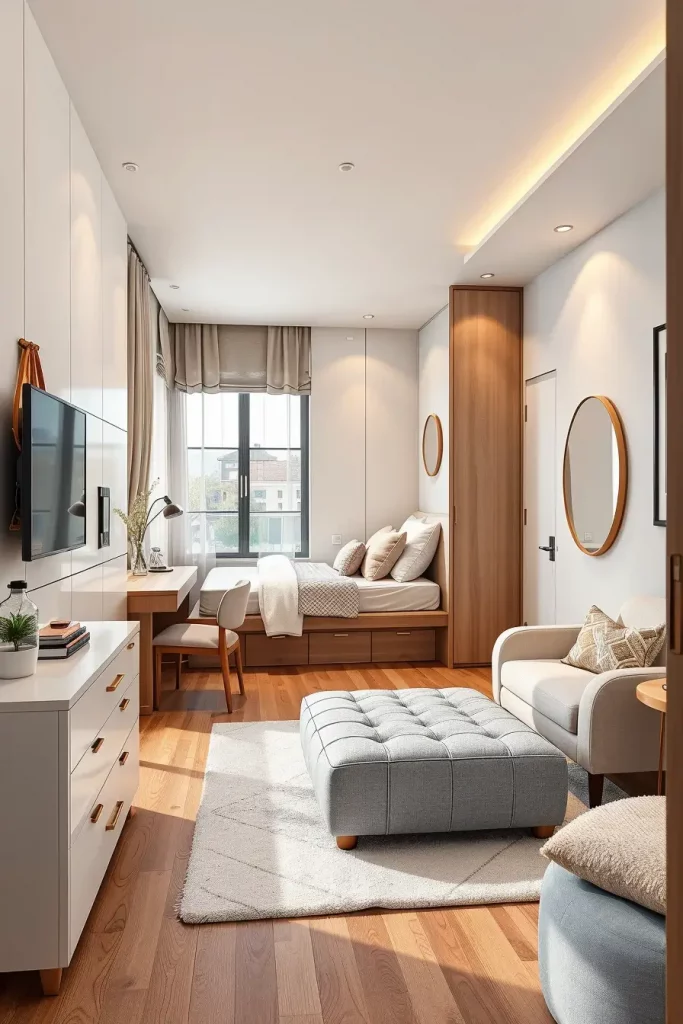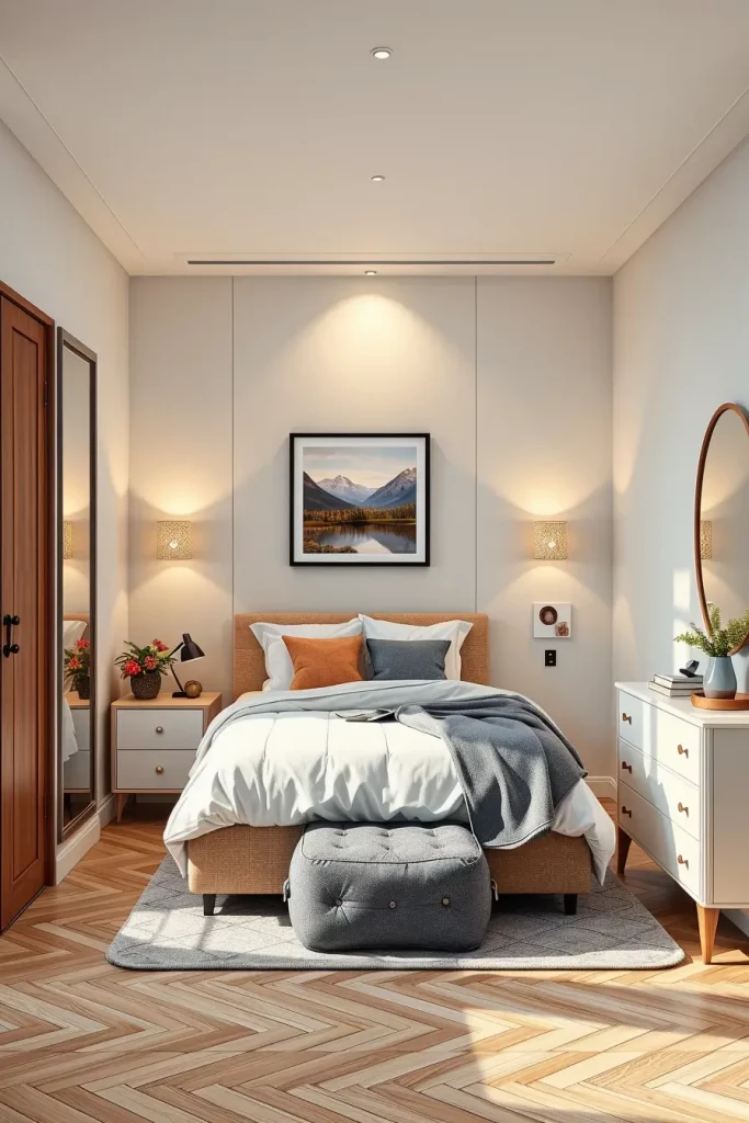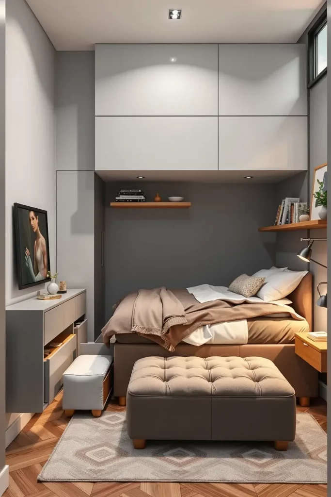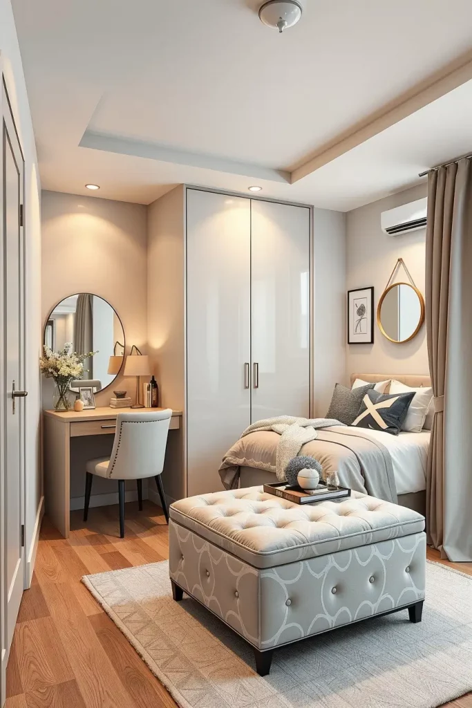I will suggest pieces like storage-inside ottomans, charging-nightstands, or wall-mounted desks that can be used as a vanity table. Every object must have at least two purposes in a small room, which will help to avoid clutter and will be in a minimalist appearance.